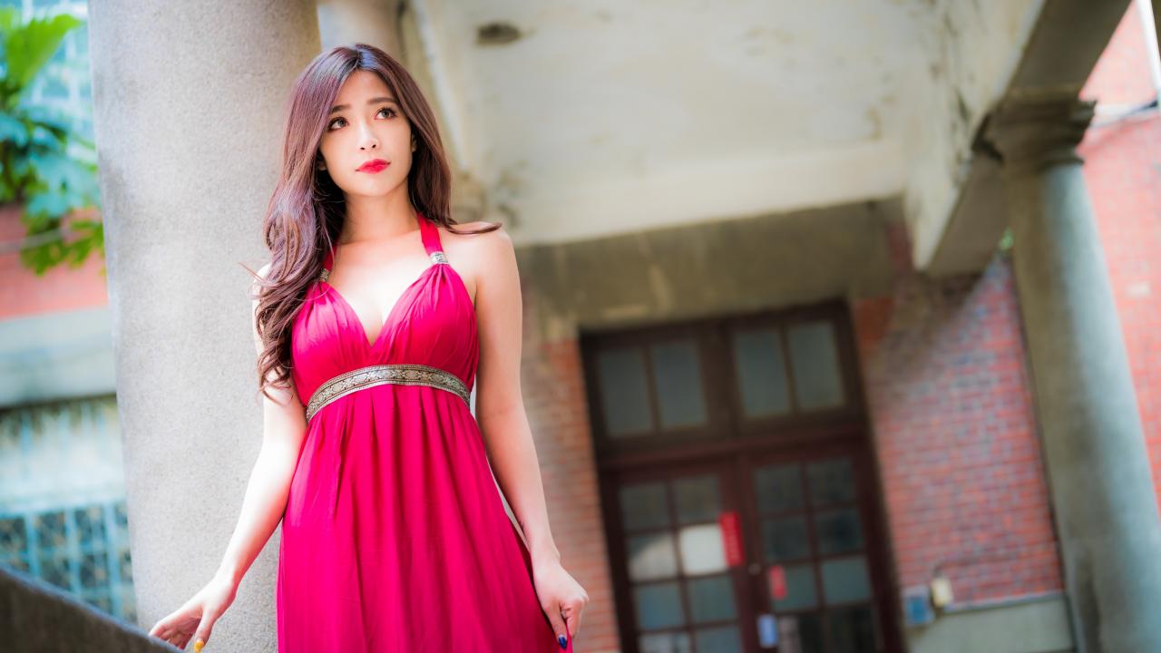 Wallpaper Girl in a beautiful pink dress near the building