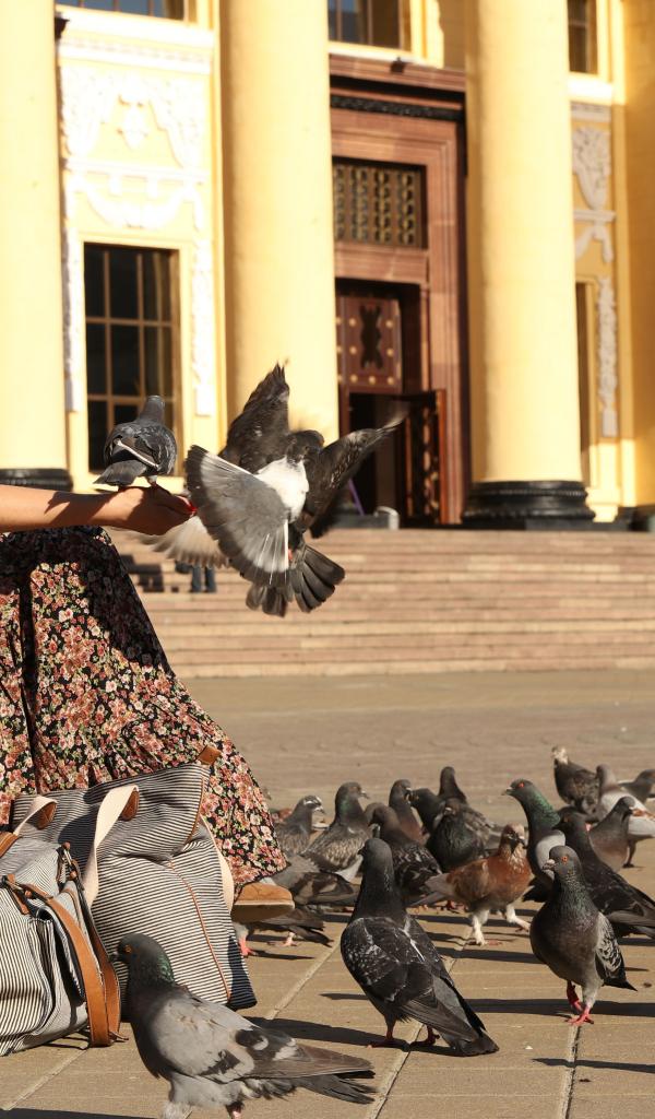 Wallpaper Young girl feeds pigeons at the train station