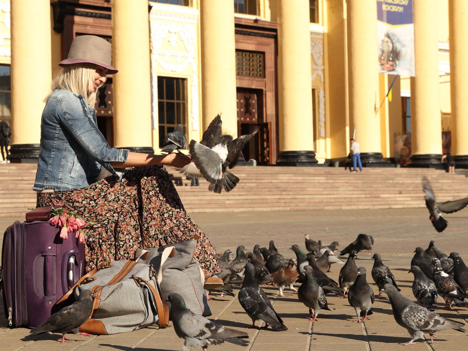 Wallpaper Young girl feeds pigeons at the train station