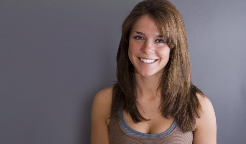 Wallpaper Smiling cute girl against a gray wall