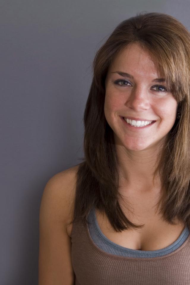 Wallpaper Smiling cute girl against a gray wall