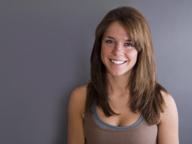 Wallpaper Smiling cute girl against a gray wall