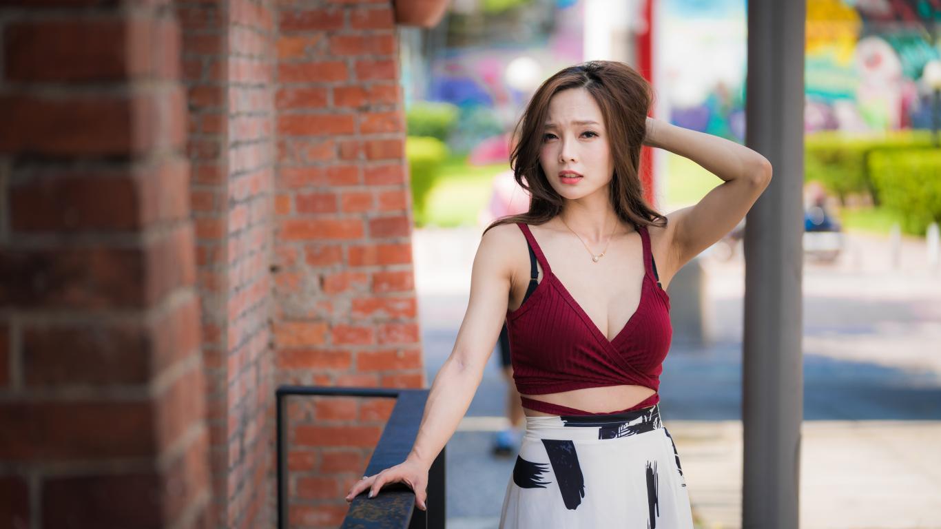 Wallpaper Beautiful Asian woman stands by a brick wall