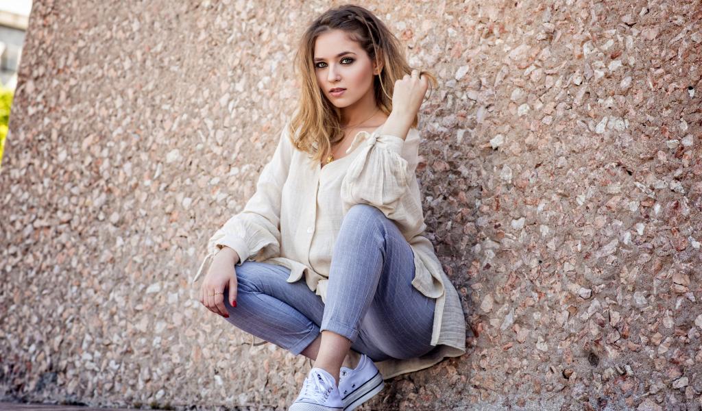 Wallpaper Beautiful girl in a suit sits against the wall