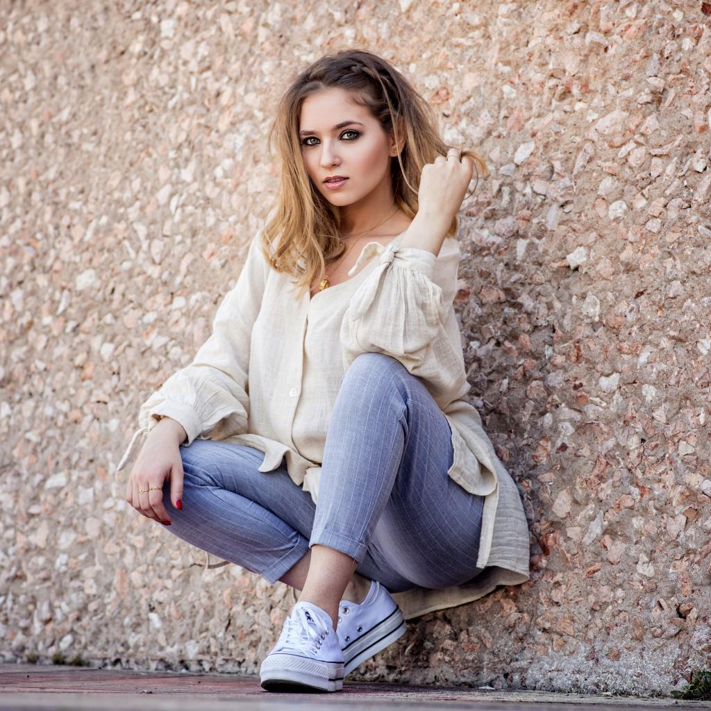 Wallpaper Beautiful girl in a suit sits against the wall