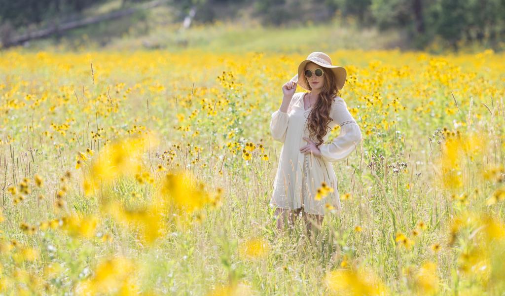 Wallpaper Beautiful girl in a hat on a field with yellow flowers