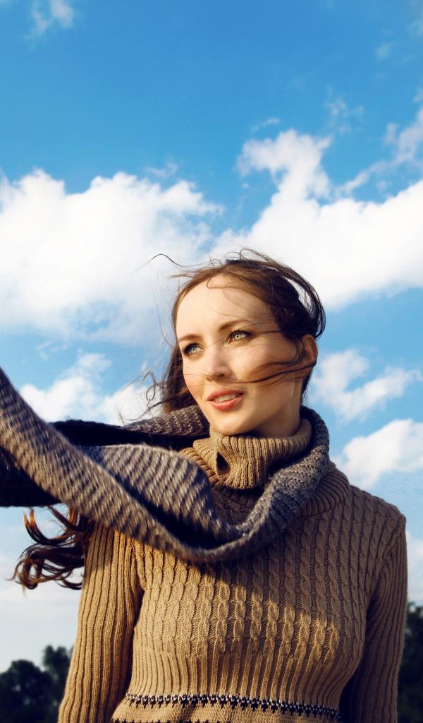 Wallpaper Young girl in a sweater against the sky
