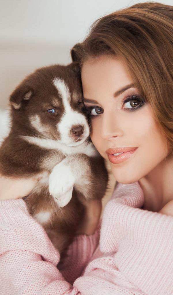 Wallpaper Beautiful young girl with a husky puppy in her arms