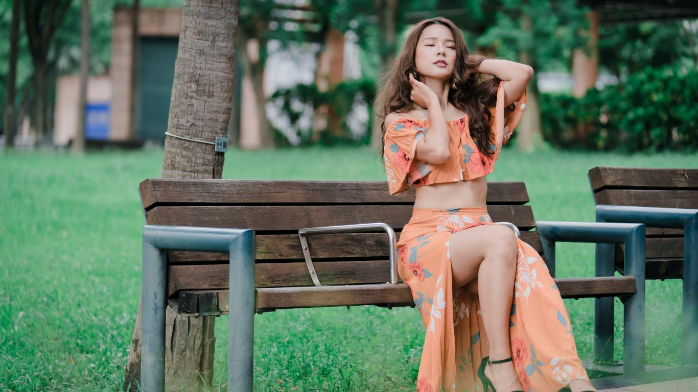 Wallpaper Beautiful Asian girl in a suit sits on a bench