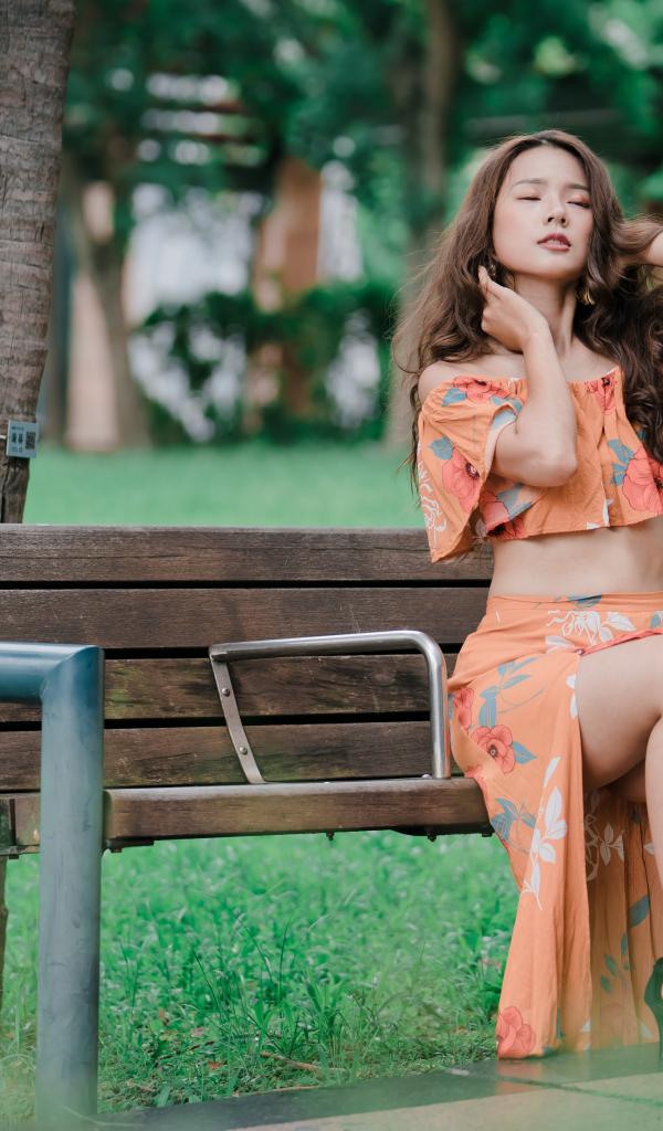 Wallpaper Beautiful Asian girl in a suit sits on a bench