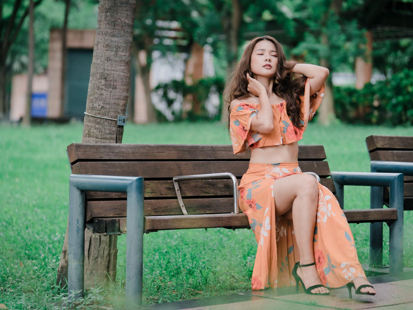 Wallpaper Beautiful Asian girl in a suit sits on a bench