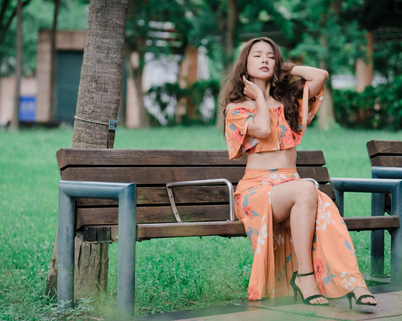 Wallpaper Beautiful Asian girl in a suit sits on a bench