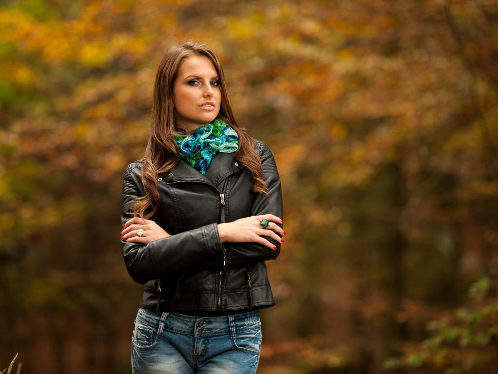Wallpaper Young girl in a black leather jacket in a park