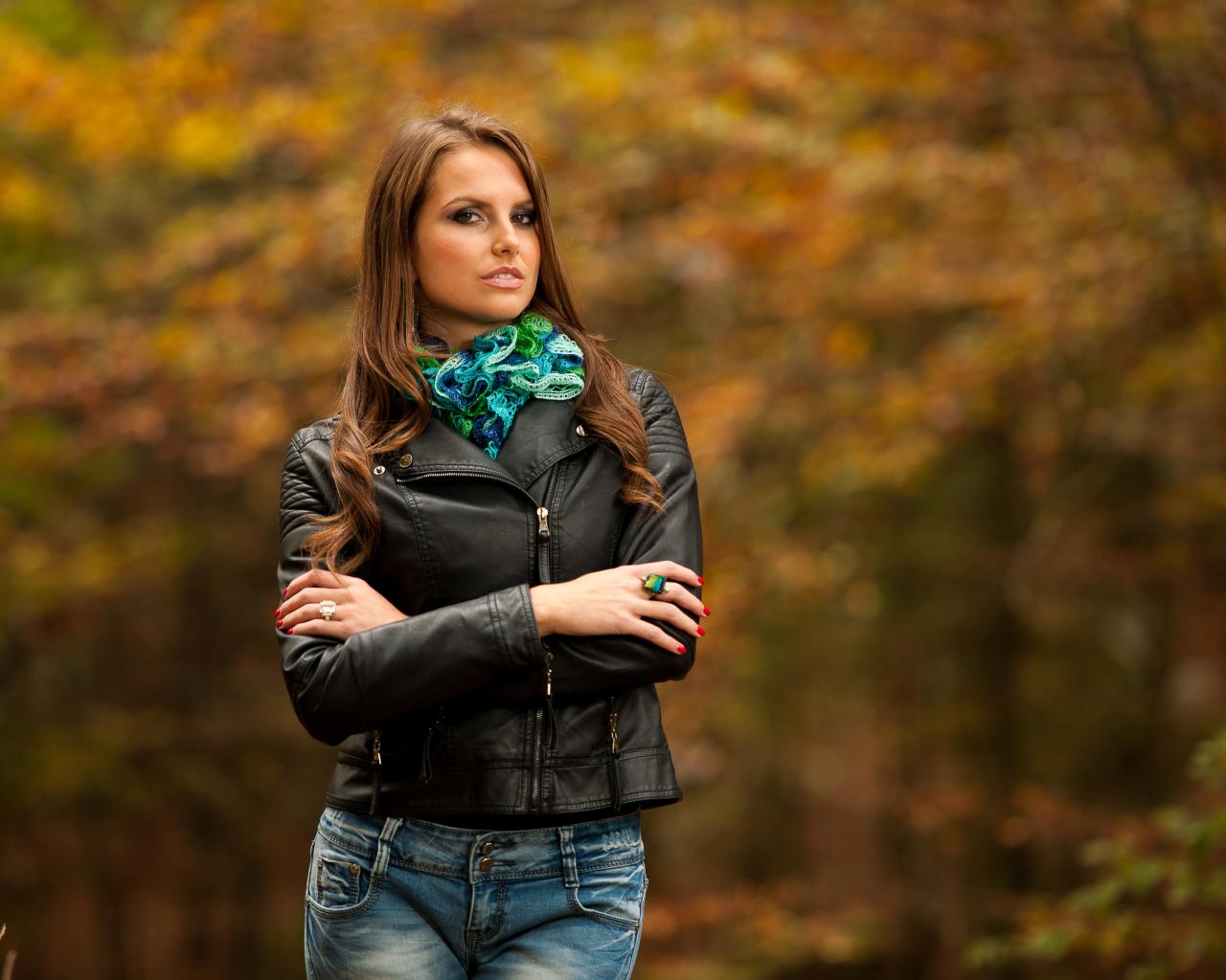 Wallpaper Young girl in a black leather jacket in a park