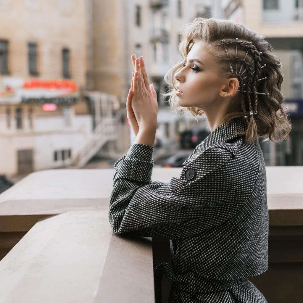 Wallpaper Beautiful girl with a hairstyle in a gray coat