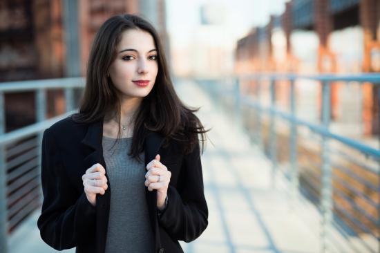 Wallpaper A young girl in a black coat stands on a bridge