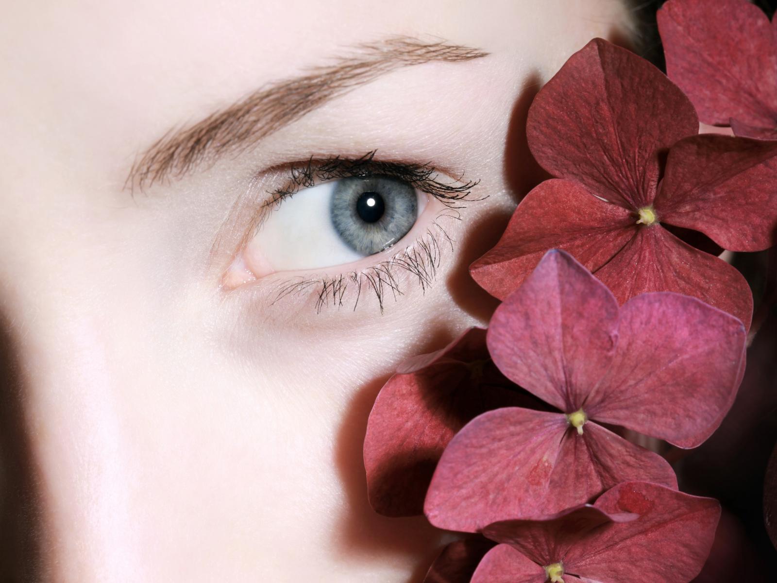 Wallpaper Eye of a beautiful girl with red flowers