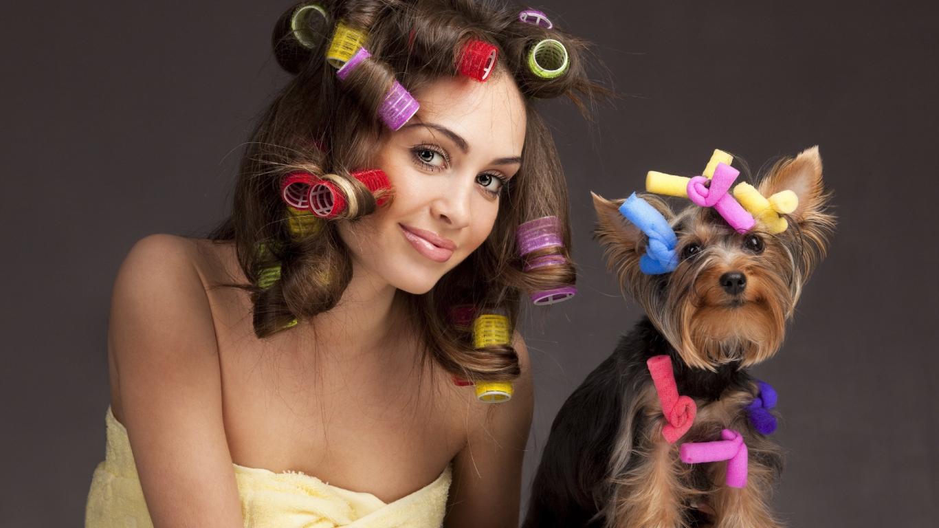 Wallpaper Girl with curlers on her head with a dog