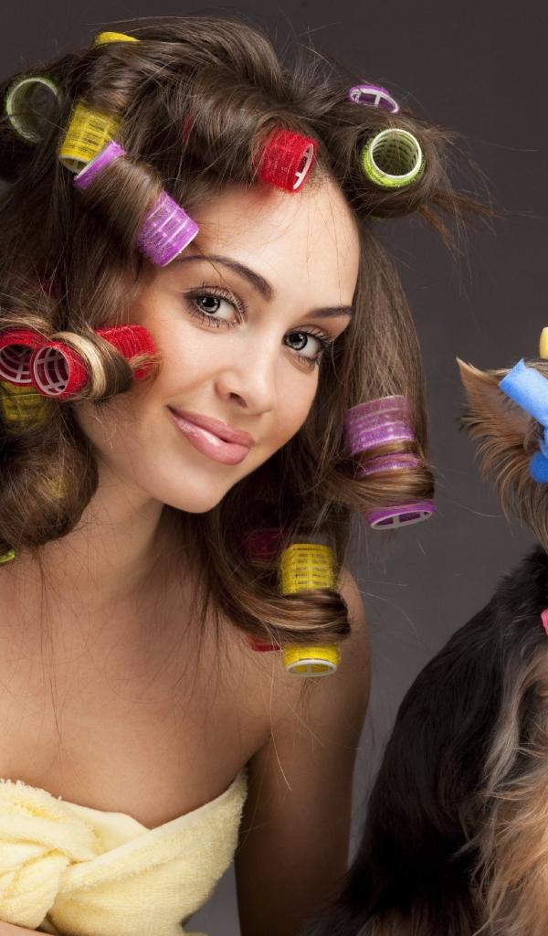 Wallpaper Girl with curlers on her head with a dog