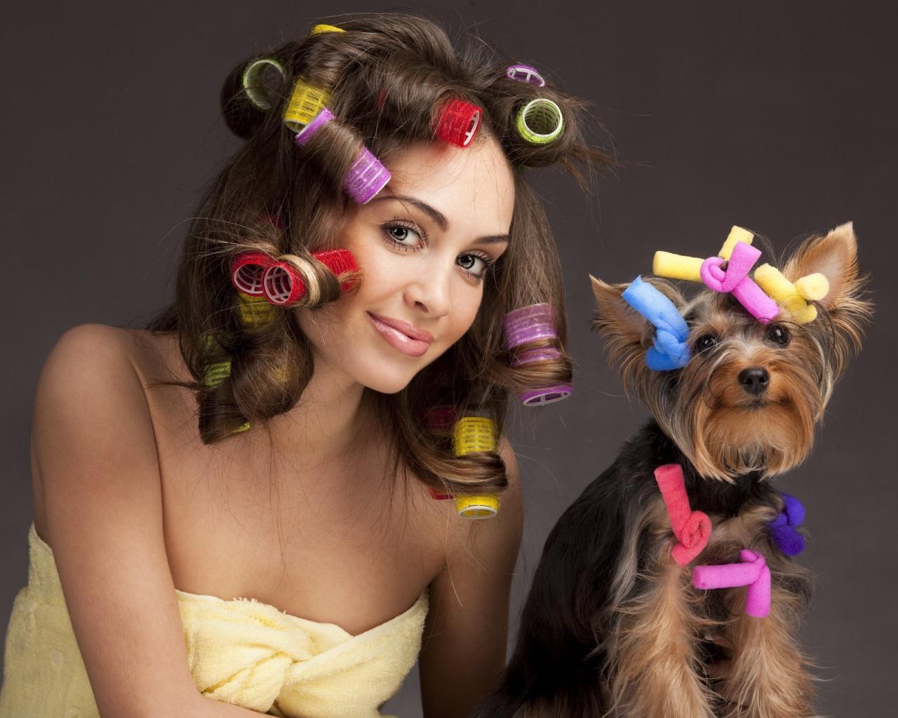 Wallpaper Girl with curlers on her head with a dog
