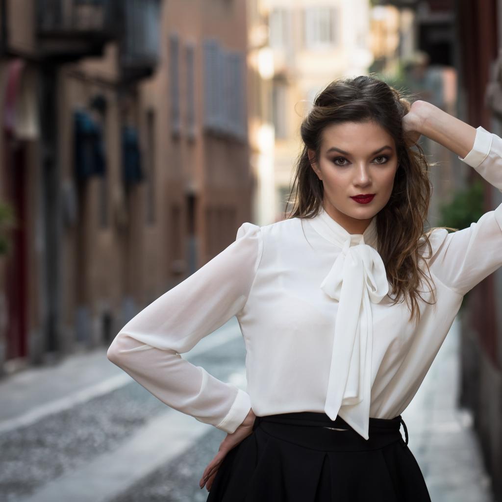 Wallpaper Young girl in a white shirt by the wall