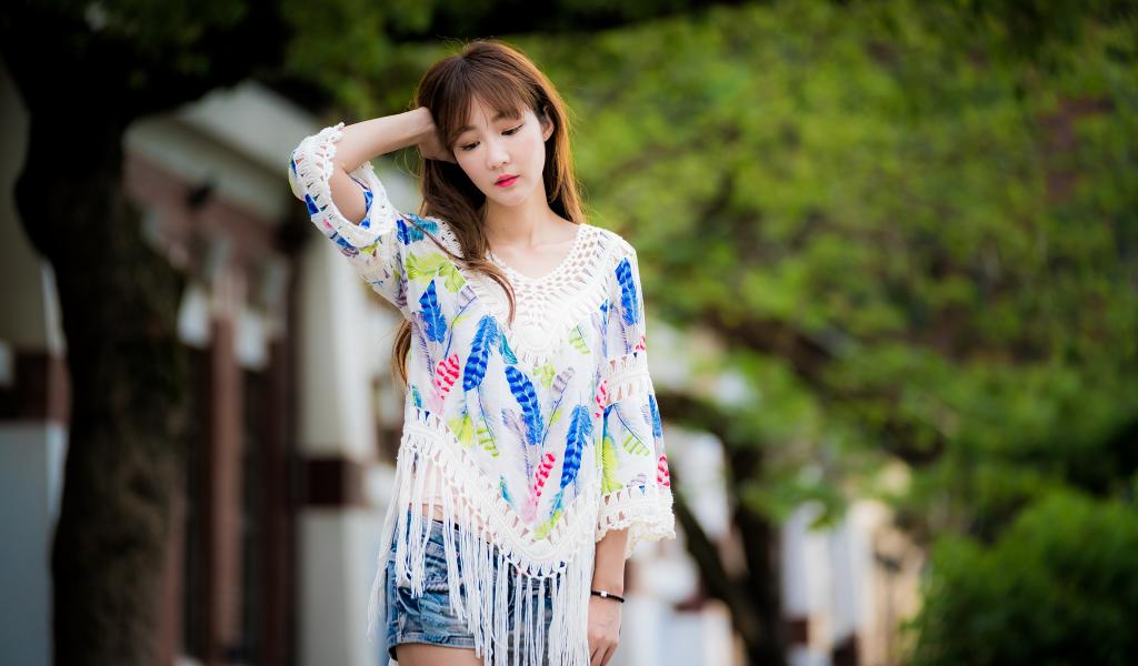 Wallpaper Asian girl in a beautiful multi-colored sweater