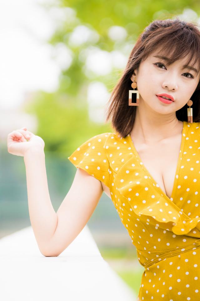 Wallpaper Beautiful Asian girl in a yellow dress in white peas