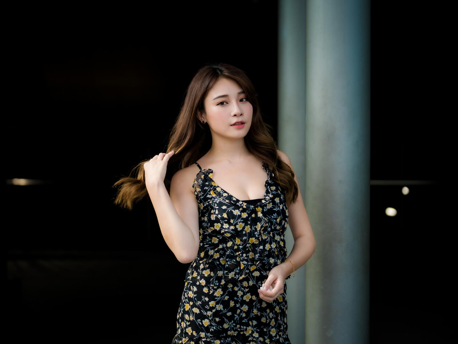 » Wallpaper Asian girl in dress touches hair