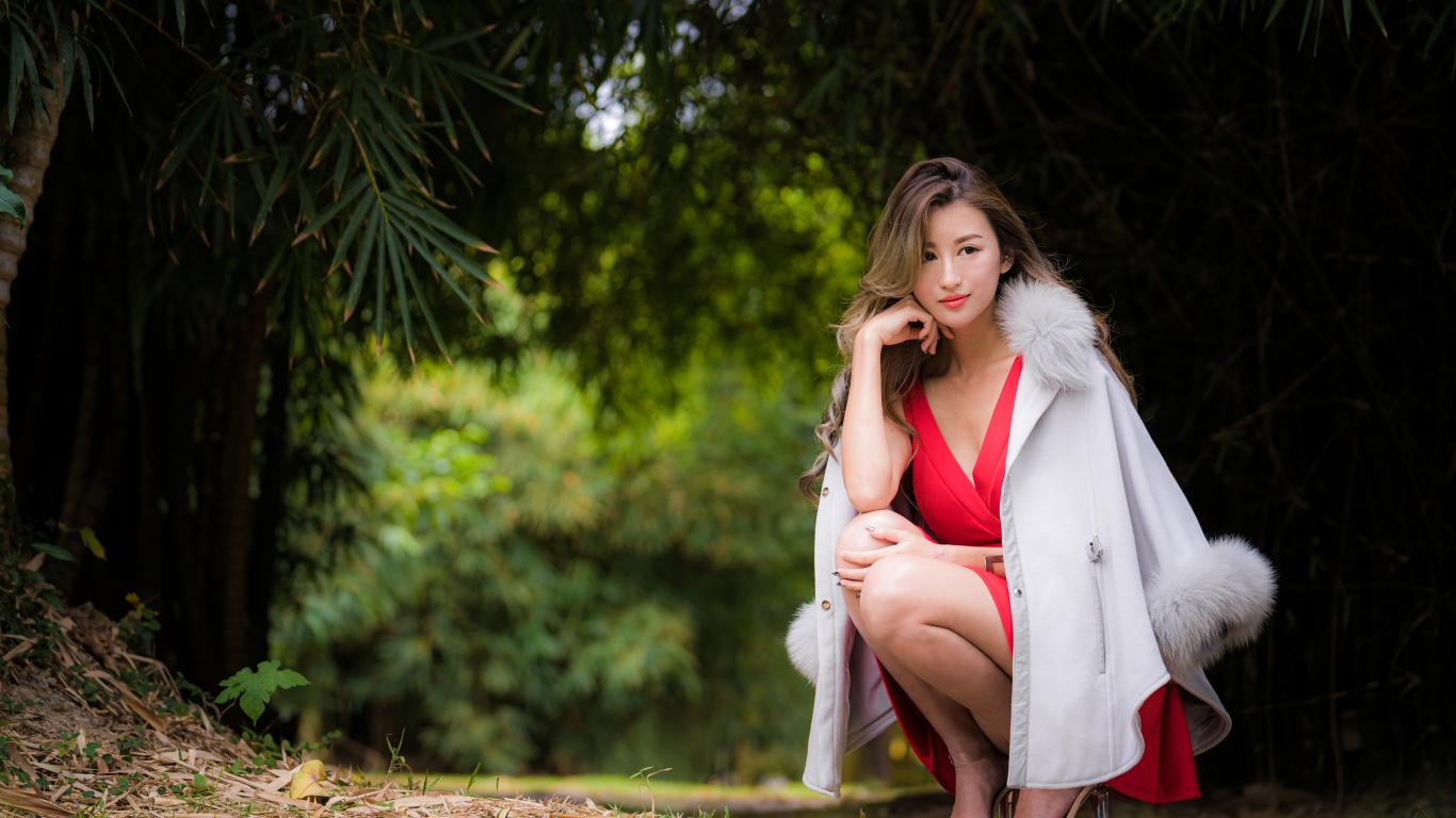 Wallpaper Asian woman in red dress is sitting in the park.