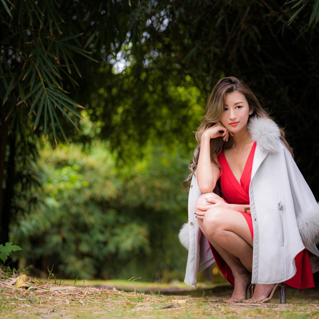 Wallpaper Asian woman in red dress is sitting in the park.