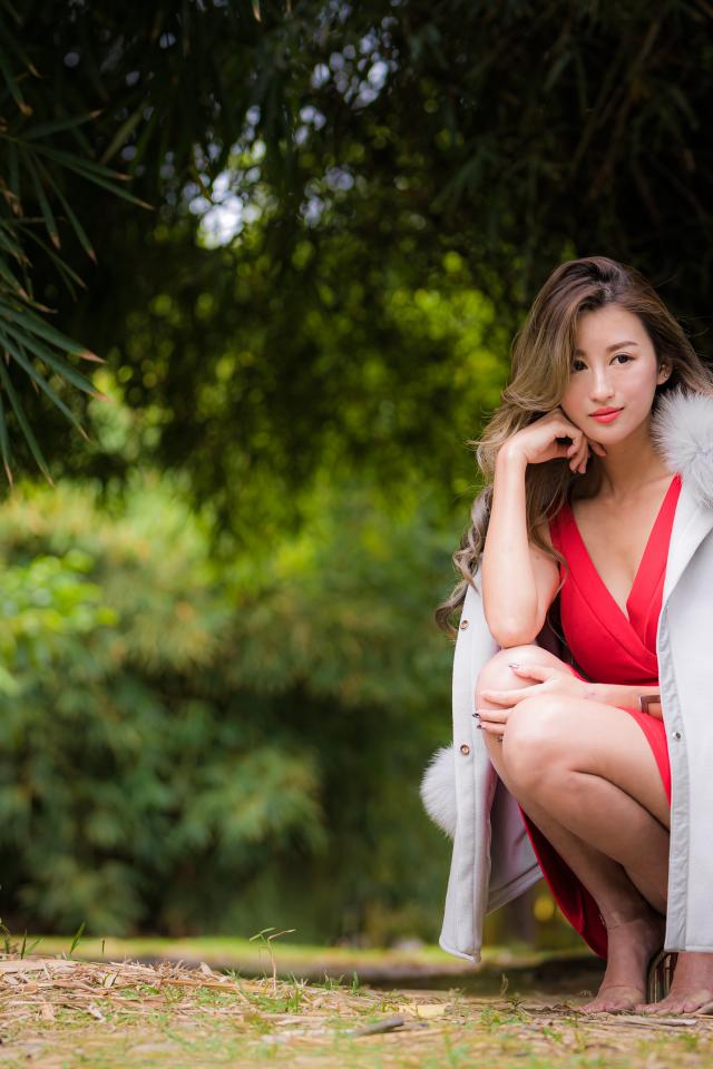 Wallpaper Asian woman in red dress is sitting in the park.