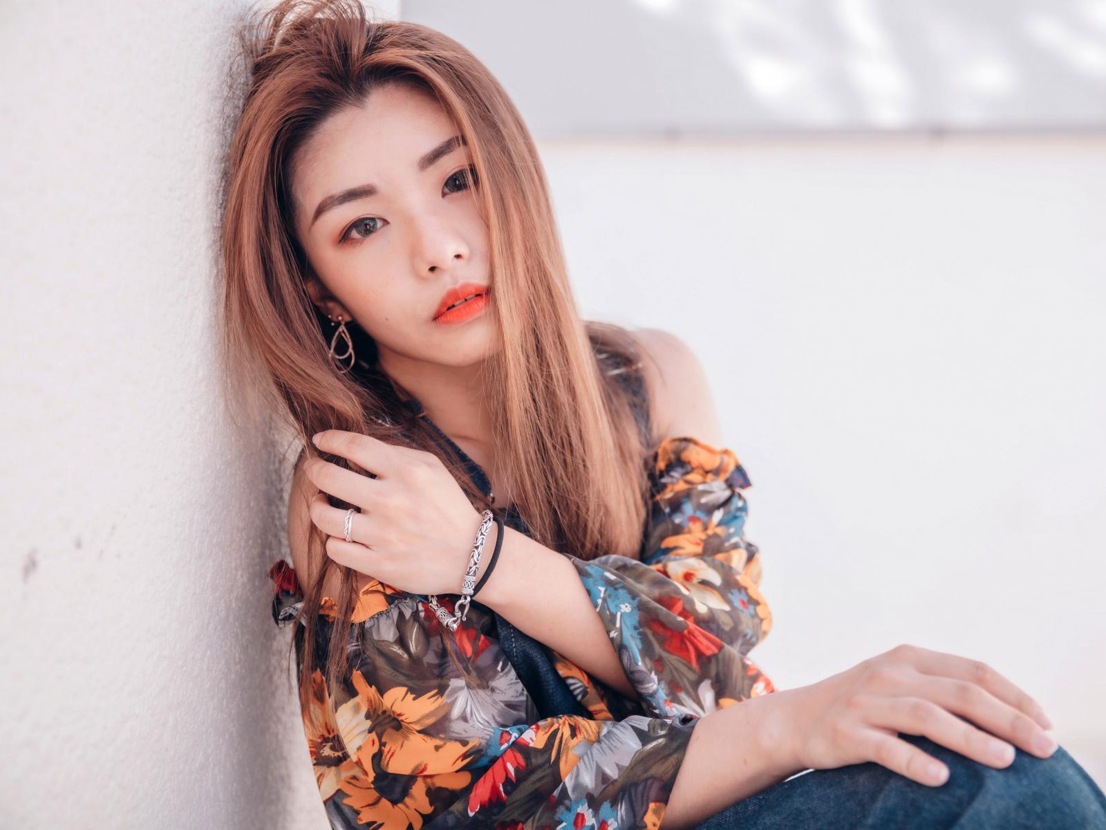 Wallpaper Asian girl sitting on the floor against the wall