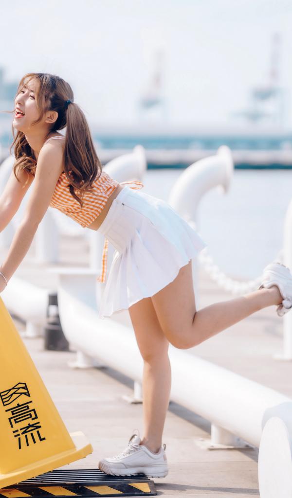 Wallpaper Asian with a short white skirt near the water