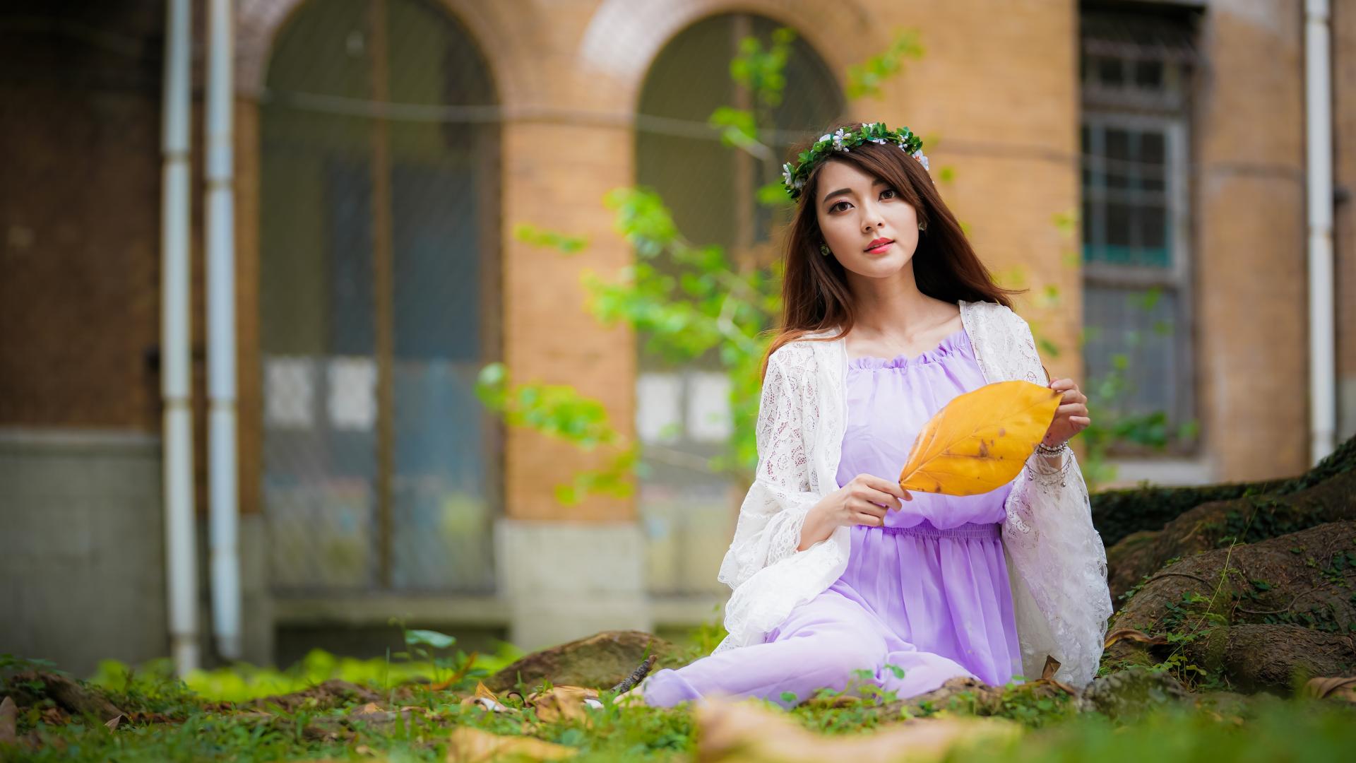 Wallpaper Girl in a beautiful dress sits on the grass
