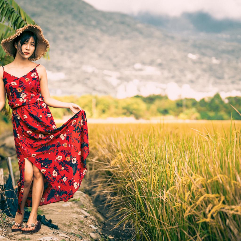 Wallpaper Young Asian in a sundress in a rice field