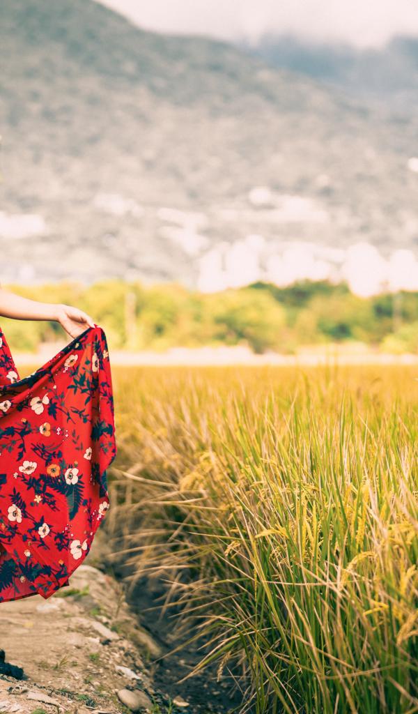 Wallpaper Young Asian in a sundress in a rice field