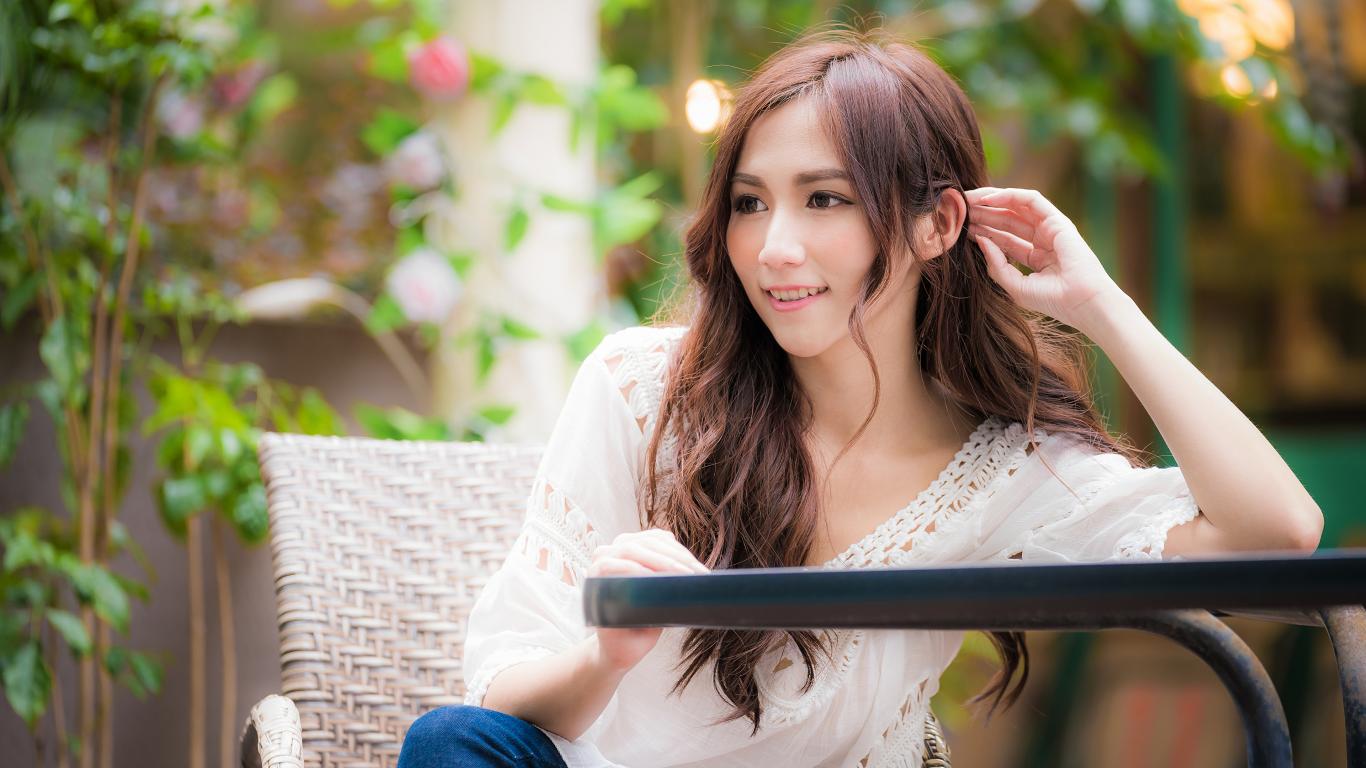 Wallpaper Smiling Asian girl sitting at a table in a cafe