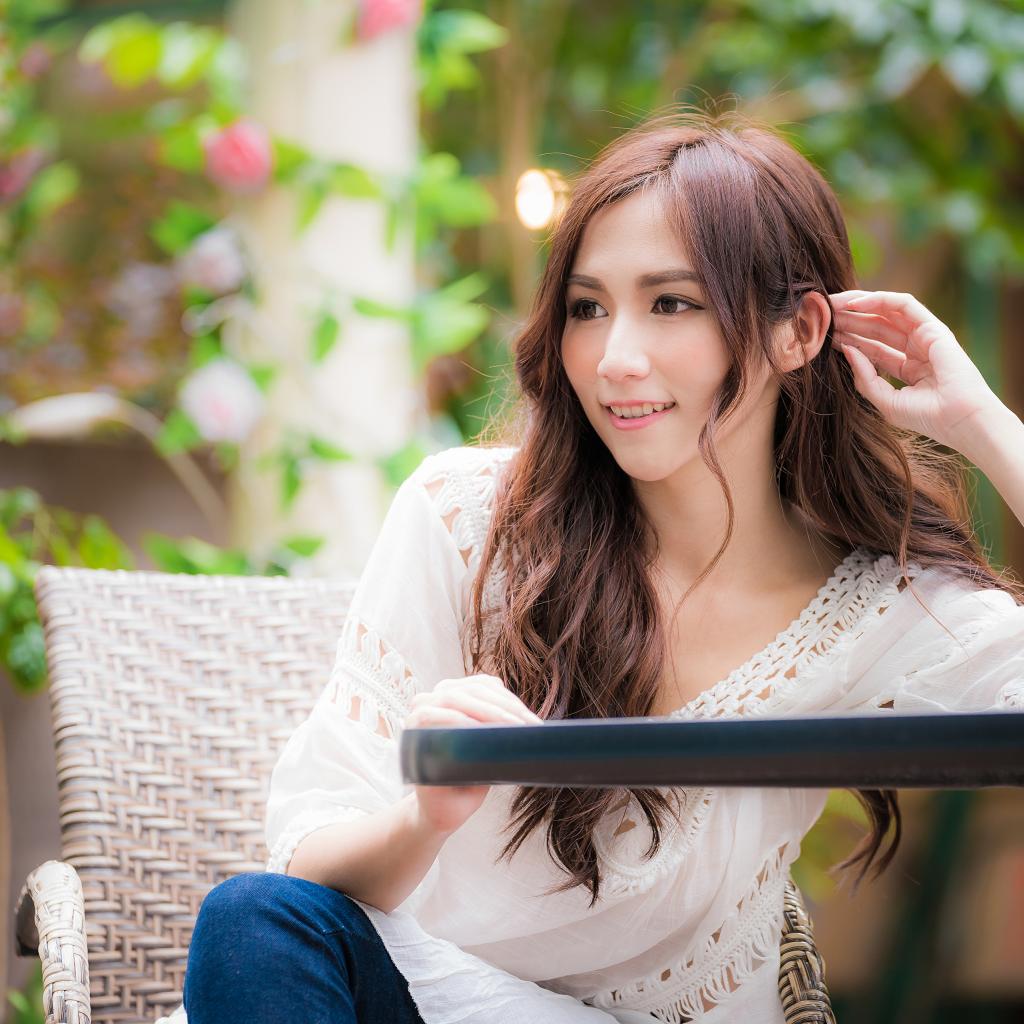 Wallpaper Smiling Asian girl sitting at a table in a cafe