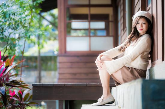 Wallpaper Asian girl in a sweater sits on the doorstep.