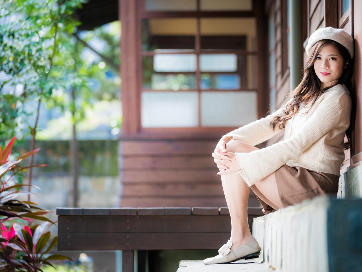 Wallpaper Asian girl in a sweater sits on the doorstep.
