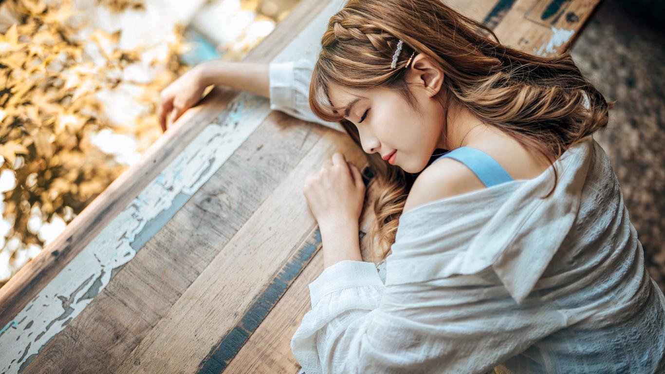 Wallpaper Cute little girl in a white dress sleeps on the table