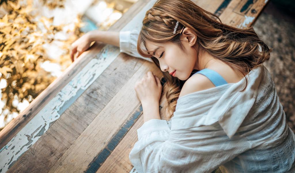 » Wallpaper Asian girl sleeps on a wooden table