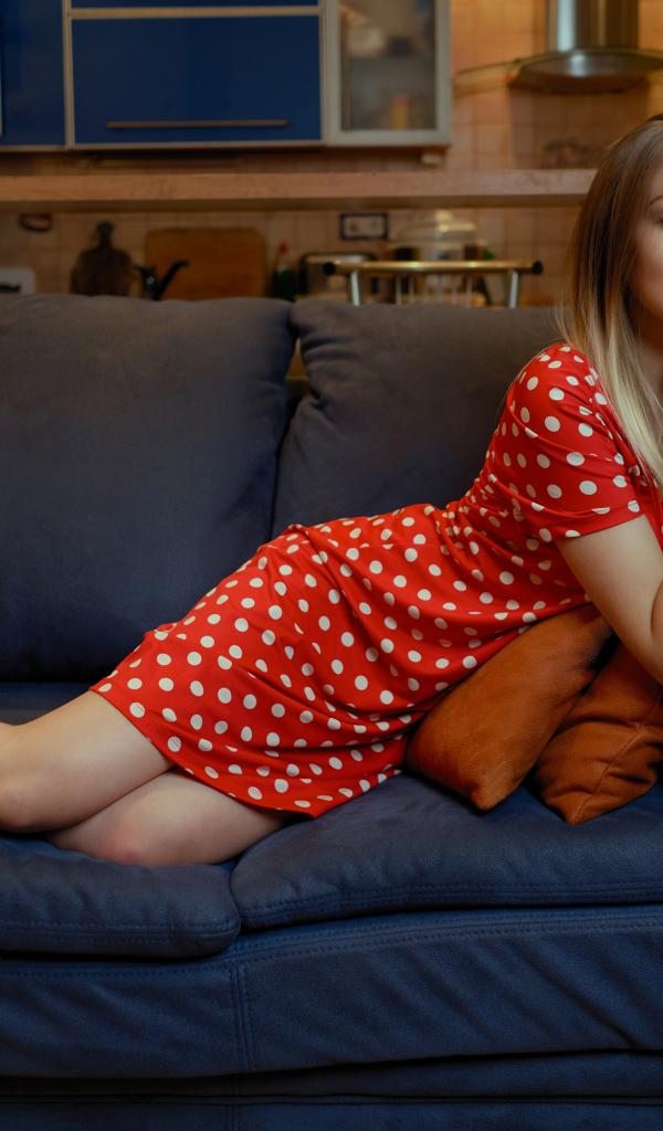 Wallpaper Girl in a red dress in white peas lies on a sofa