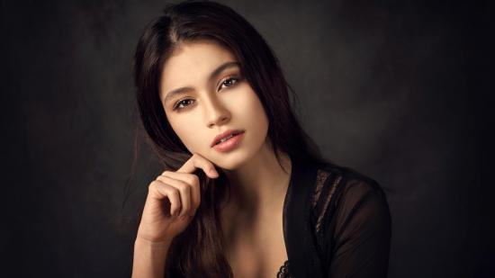 Wallpaper Beautiful girl in black sits on a gray background