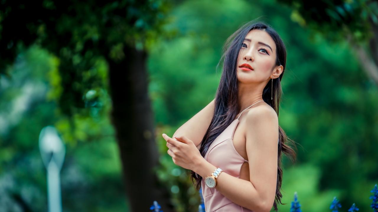 Wallpaper Beautiful Asian girl in a beautiful pink outfit in the park