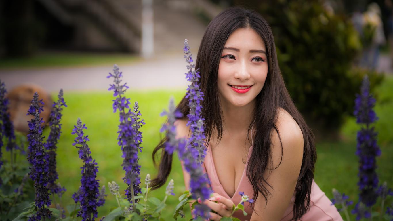 Wallpaper A smiling Asian woman stands by the blue flowers.