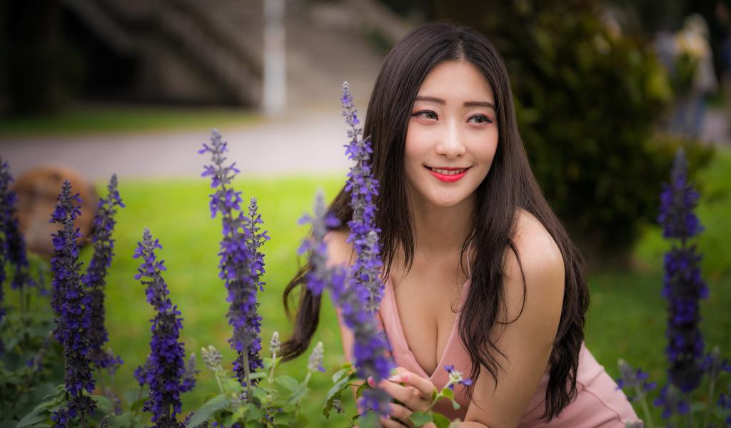 Wallpaper A smiling Asian woman stands by the blue flowers.