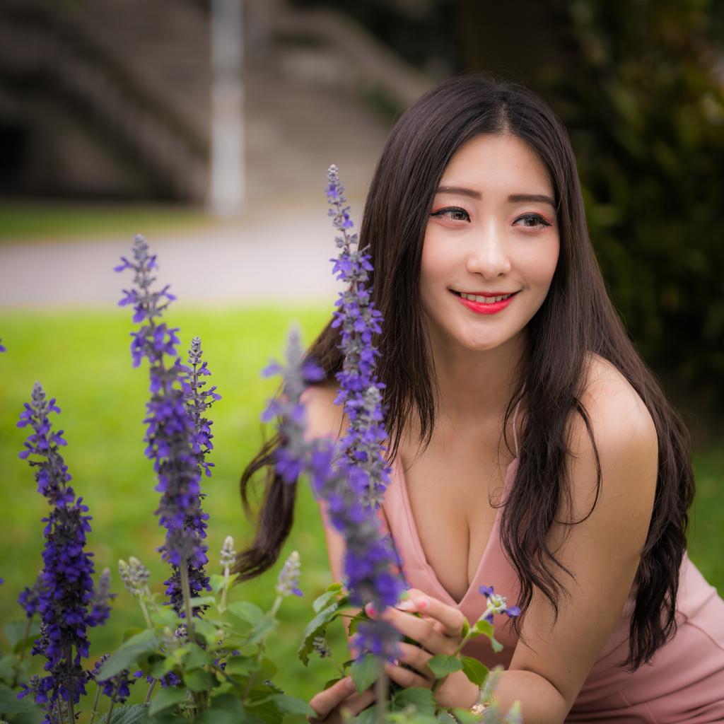 Wallpaper A smiling Asian woman stands by the blue flowers.