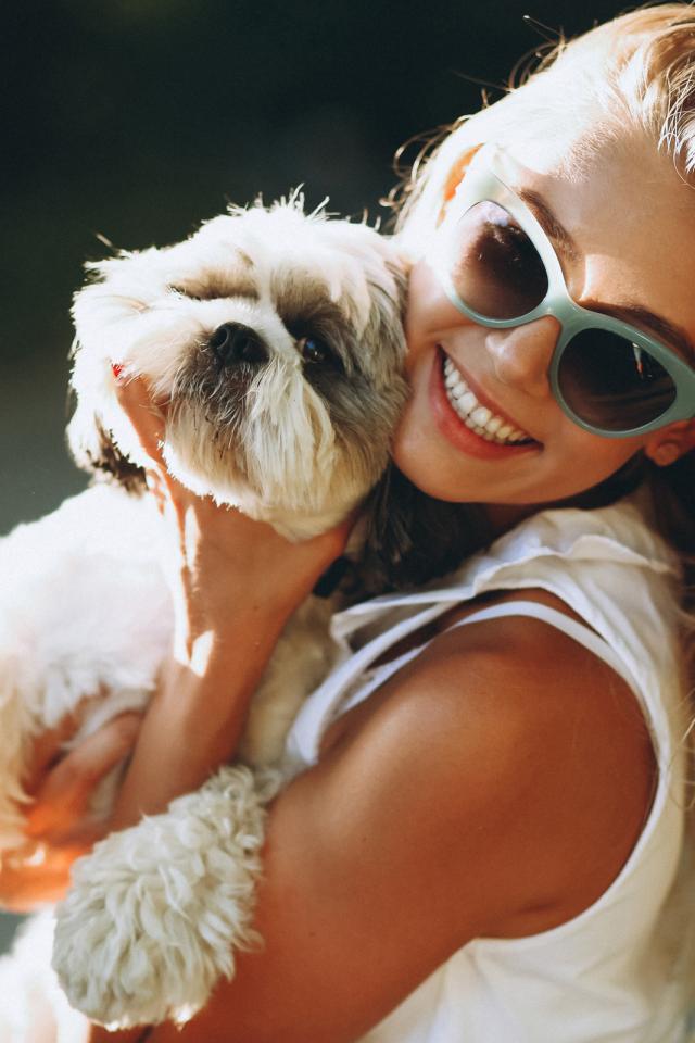 Wallpaper Smiling girl in sunglasses with a dog in her arms