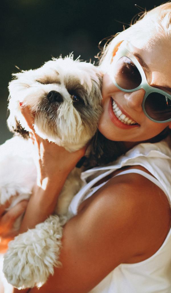 Wallpaper Smiling girl in sunglasses with a dog in her arms